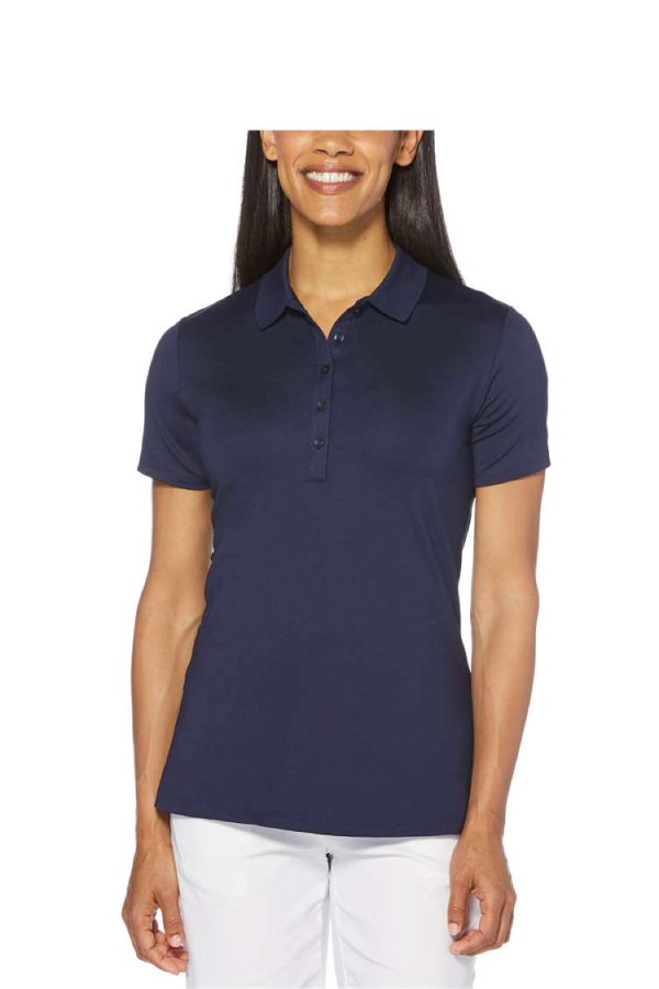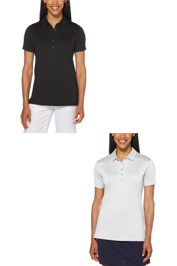 5.3 oz. 95/5 spandex jersey knit fabric. Opti-Dri technology transfers moisture away from the body to keep you cool and dry. UV Repel technology keeps skin safe from the sun's harmful rays. UPF 50. Stretch fabric moves with you to increase your range of motion. Rib knit collar. 5-button placket with Callaway embossed buttons. Double needle hemmed bottom with side vents. Princess seam detail stitching on back for a feminine look. Heat seal label provides tag-free comfort. Tonal embroidered Chevron on back neck.
