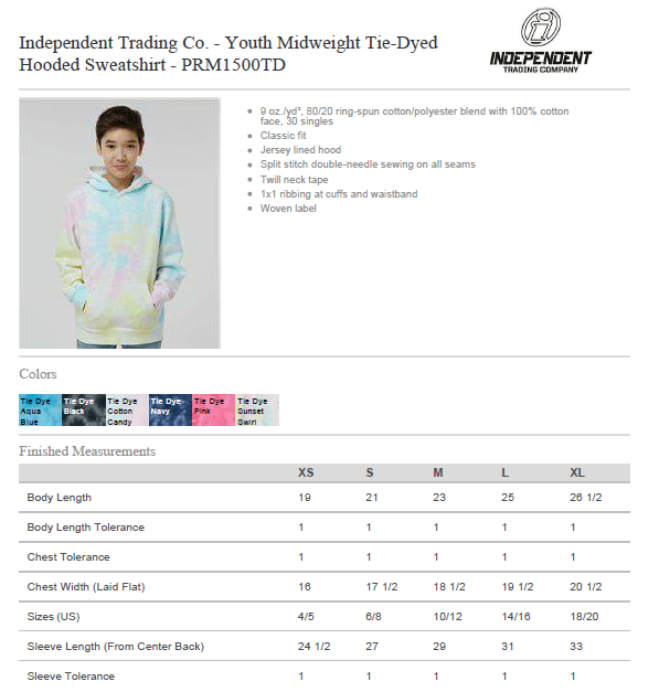 Youth Midweight Tie Dye Hooded Pullover Youth Midweight Tie Dye Hooded Pullover PRM1500TD (Includes Printed Full Front Logo) 9 oz./yd², 80/20 ring-spun cotton/polyester blend with 100% cotton face, 30 singles