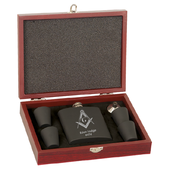 6oz Matte Black Stainless Steel Flask Set in Wood Presentation Box6oz Matte Black flask comes with four shot glasses and a funnel for easy filling and is expertly laser engraved for a permanent mark that will never wear away or wash off. The set also features a beautiful hinged Rosewood box for safe keeping. Lasers silver, logo added at no extra cost. |