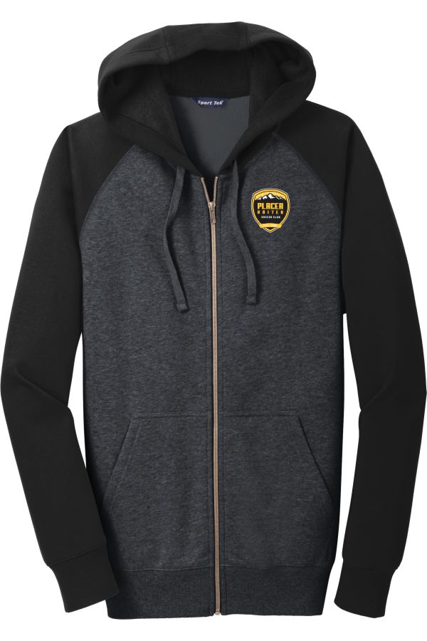 Men's Zip Up ST269 w/ embroidered logoSport-Tek Raglan Colorblock Full-Zip Hooded Fleece JacketAn exposed zipper and contrast raglan sleeves give this shrink-resistant jacket a vintage look. 9-ounce, 65/35 ring spun combed cotton/poly fleece Three-panel hood Dyed-to-match drawcords Metal zipper 2x2 rib knit cuffs and hem with spandex Raglan sleeves Front pouch pocket |
