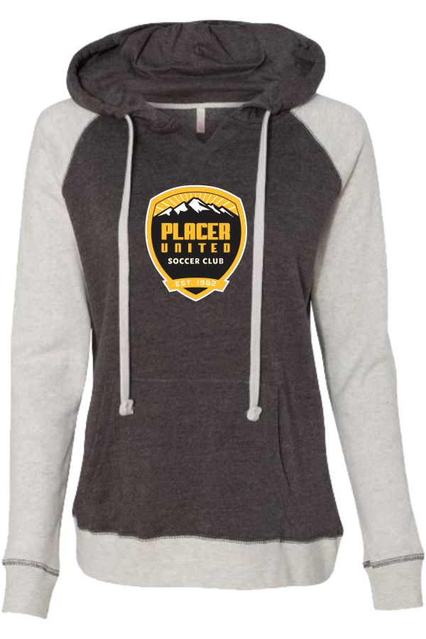 Ladies Hoodie W17127 w/ printed logoMV Sport - Women’s Harper Raglan Hooded Sweatshirt8 oz./yd², 55/45 cotton/polyester Jersey lined hood with contrast drawcord Contrast 1x1 rib knit cuffs and waistband Contrast raglan sleeves V-neck with raw edge 1x1 rib knit insert detail Pouch pocket |