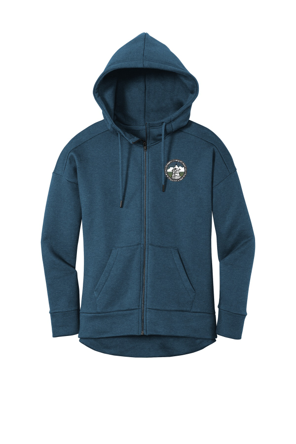 Ladies Fleece Drop Shoulder Full-Zip Hoodie - Embroidered Logo-DT1104 District Women s Perfect Weight Fleece Drop Shoulder Full-Zip Hoodie DT1104 Perfect fleece in our premium 8.26-ounce weight. 8.26-ounce 80/20 combed ring spun cotton/poly fleece; 100% combed ring spun cotton face (Solids Heathered Steel) 8.26-ounce 65/35 combed ring spun cotton/poly fleece (All other heathered colors) Jersey-lined hood Zip-through hood Drop shoulder Twill back neck tape Dyed-to-match drawcords with metal tips Self-fabric cuffs and hem High-low hem Tear-away label Product Spec Sheet Color Swatch