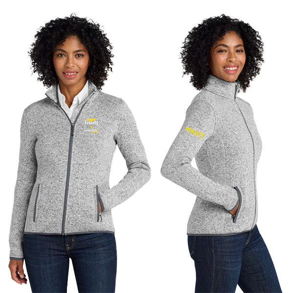 Ladies Sweater Fleece Jacket - TRINITY LOGOThe comfort of a sweater joins the unbeatable warmth of fleece in this modern style. Contrast binding at the cuffs pockets and hem heightens the visual appeal. 8.8-ounce 100% polyester sweater fleece Reverse coil zipper with chin guard Full-length interior storm flap Stretch binding at cuffs and hem Front zippered pockets with knotted zipper pulls and binding trimProduct MeasurementsProduct Spec Sheet Color Swatch |