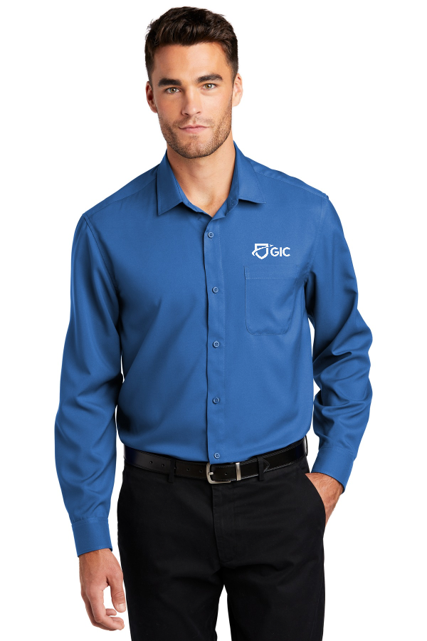 Long Sleeve Performance Staff Shirt W401 Embroidered Logo on Left chest Above Pocket Embroidered Logo on 3.3-ounce 100% polyester Stain release Odor-fighting Moisture-wicking Wrinkle-resistant Open collar French placket Dyed-to-match buttons Left chest pocket Rounded adjustable cuffs Product Spec Sheet Color Swatch
