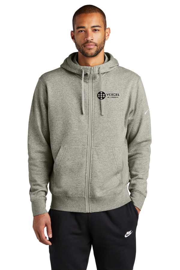 Nike Club Fleece Sleeve Swoosh Full-Zip Hoodie Nike Club Fleece Sleeve Swoosh Full-Zip Hoodie This brushed-back fleece hoodie is where comfort meets street-ready Nike style. Jersey-lined three-panel hood with dyed-to-match drawcords and zipper (Charcoal Heather has anthracite drawcords and zipper). Front pockets. Rib knit cuffs and hem. A contrast Swoosh logo is embroidered on left sleeve. Made of 8.2-ounce 72/20/8 cotton/polyester/organic cotton. Product Spec Sheet Color Swatch