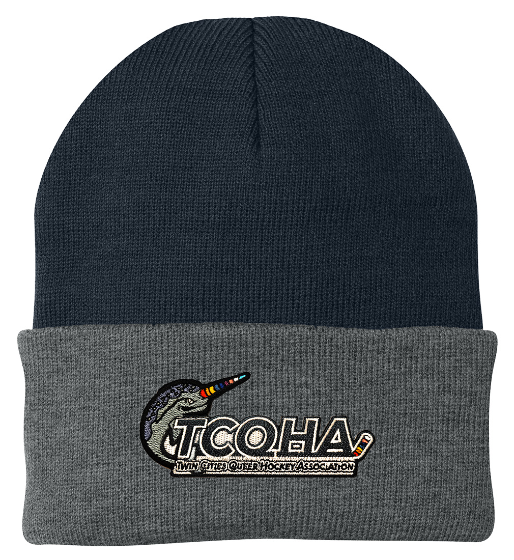 Knit Cap Port Authority Knit Cap. CP90 Keep your head well covered during cooler weather in our cap that has a 3-inch folding cuff for easy embroidery.100% acrylic (Solid) 68/32 poly/acrylic (Athletic Oxford) 66/34 acrylic/poly (Athletic Oxford/Black) 60/40 acrylic/poly (Black/Athletic Oxford Navy/Athletic Oxford)Note: White is yellower/creamier and not a true white. Product Spec Sheet Color Swatch Patch Options