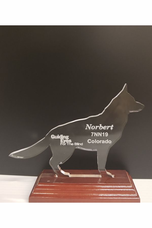 Guiding Eyes Shepherd Clear acrylic, High gloss rosewood base, Guiding Eyes logo, 3 lines of engraving Enter your engraving in the boxes below.