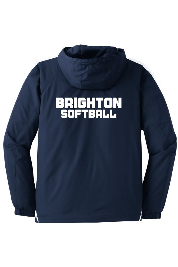Description 100% polyester shell 100% polyester jersey lining with mesh insets at gussets for added breathability Three-panel hood with drawcord and toggle Raglan sleeves Front pouch pocket Articulated elbows for greater mobility Half elastic half self-fabric cuffs for comfort Left side seam zipper for easy on/off Drawcord hem with toggle Embroidered and printed