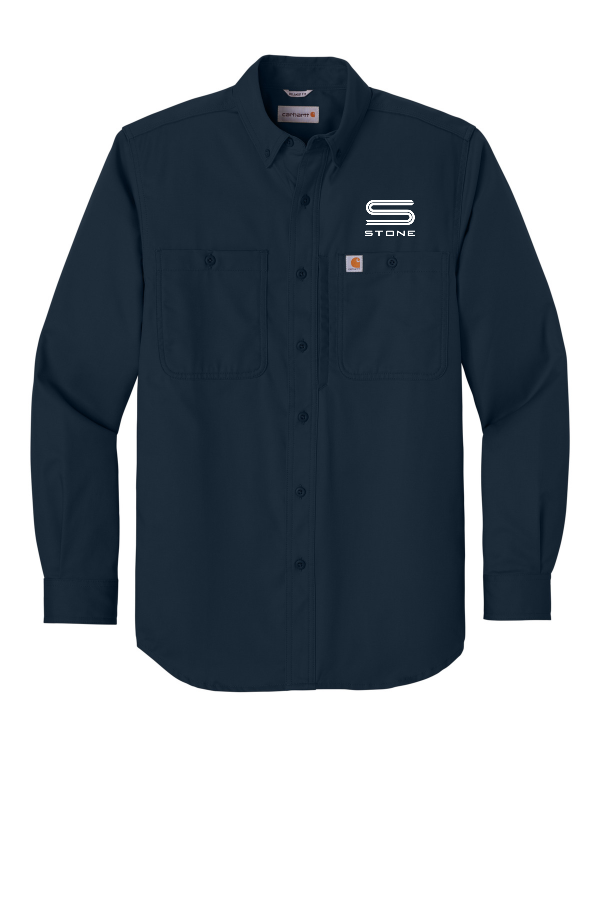 Description Clean and simple this button-down work shirt can do it all. A triple-stitched wrinkle-free design maintains a professional appearance day in and day out. 5-ounce 58/39/3 cotton/poly/spandex Rugged Flexdurable stretch technology for ease of movement Button-down collar Two chest pockets with button closures Left chest map pocket with zipper closure Carhartt label sewn on left chest pocket Carhartt-strong triple-stitched main seamsTwo-button adjustable cuffsRelaxed fit