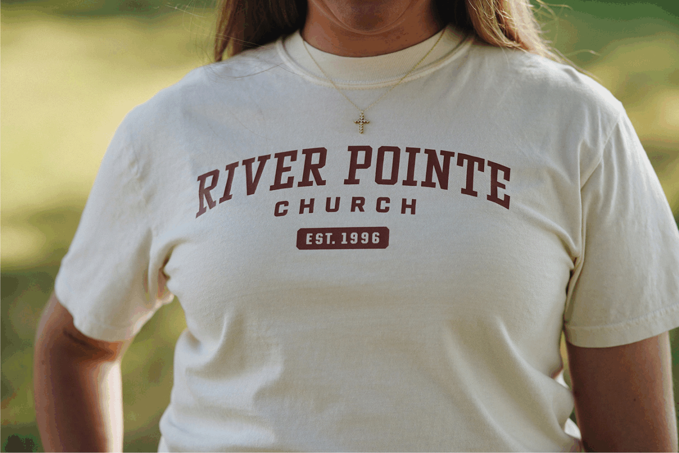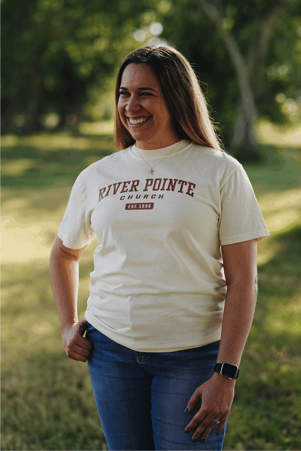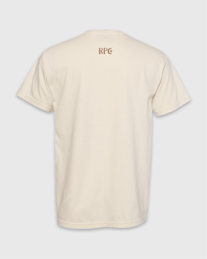 Unisex Ivory T- Shirt. Front has "RIVER POINTE CHURCH EST. 1996" printed in brown. Back has our "RPC logo" in brown print, just below collar.