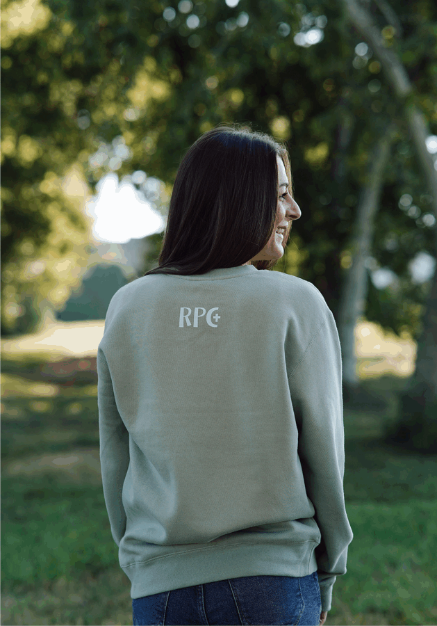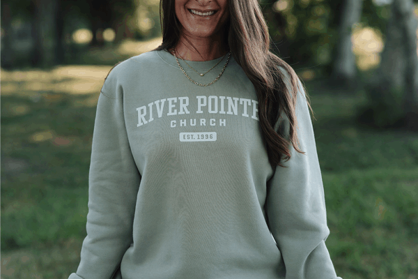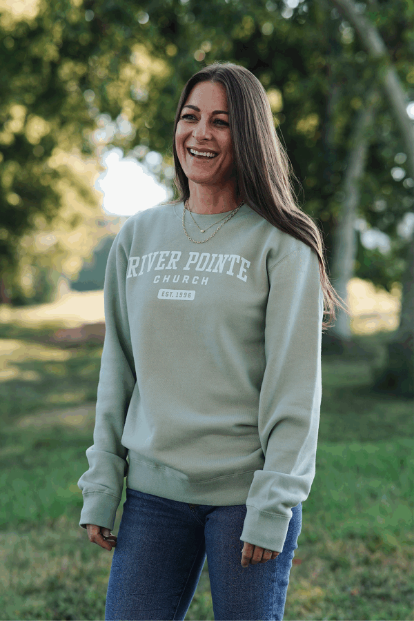 Description Unisex Dusty Sage Heavyweight Crewneck Sweatshirt. Front has "RIVER POINTE CHURCH EST. 1996" printed in white. Back had "RPC logo" in white print, just below collar.