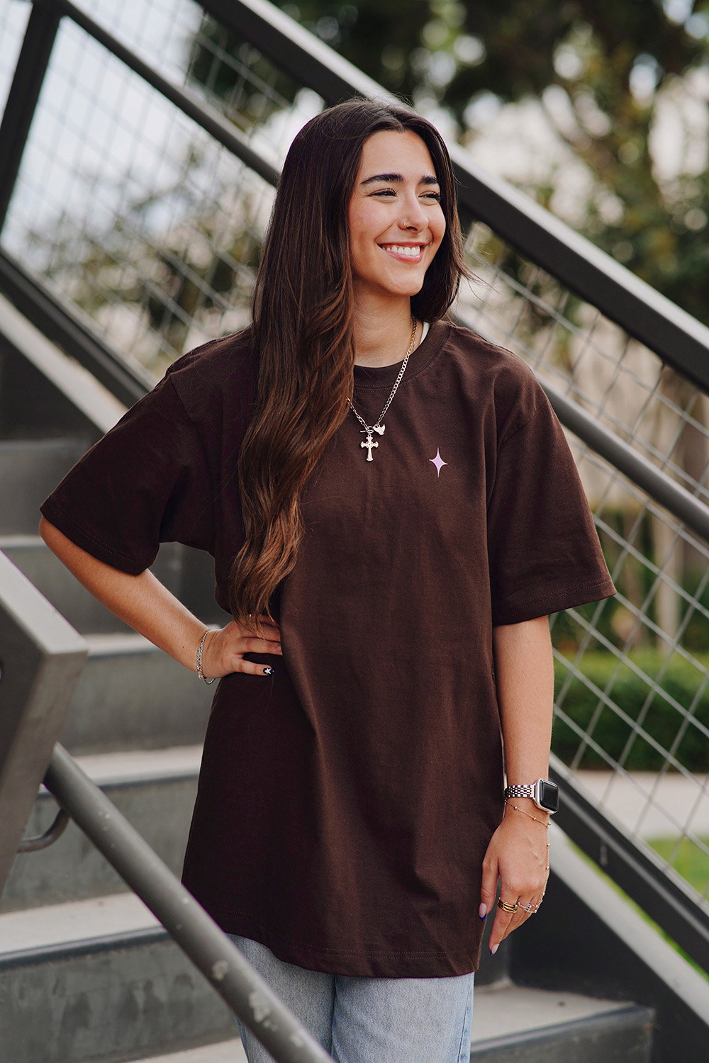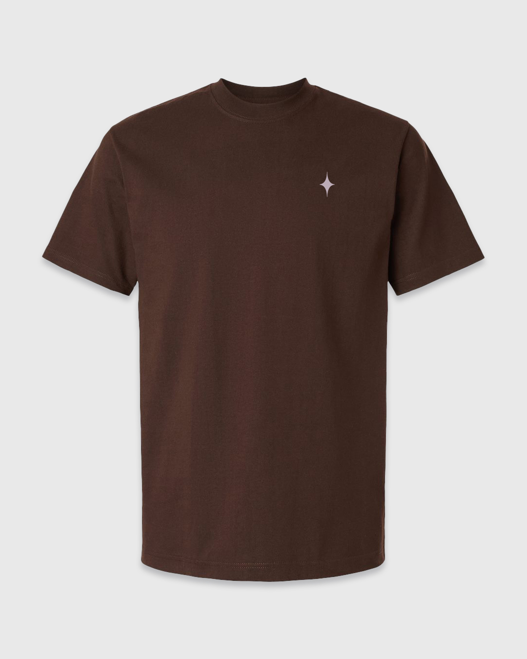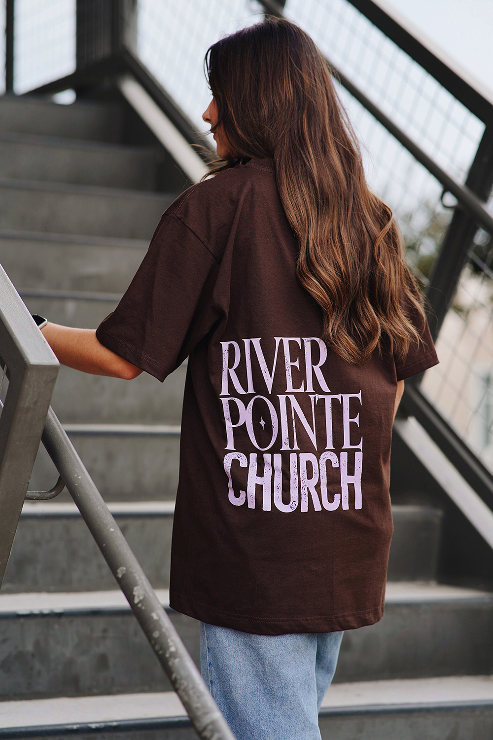 Unisex Brown Heavyweight Street T- Shirt. Front has small diamond shape in light purple in top corner. Back has "RIVER POINTE CHURCH" stacked and printed in light purple.