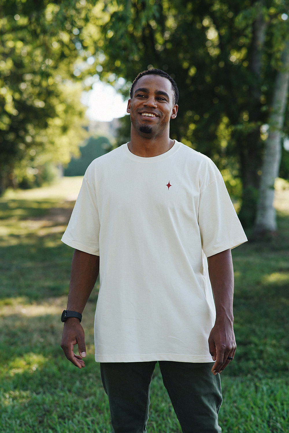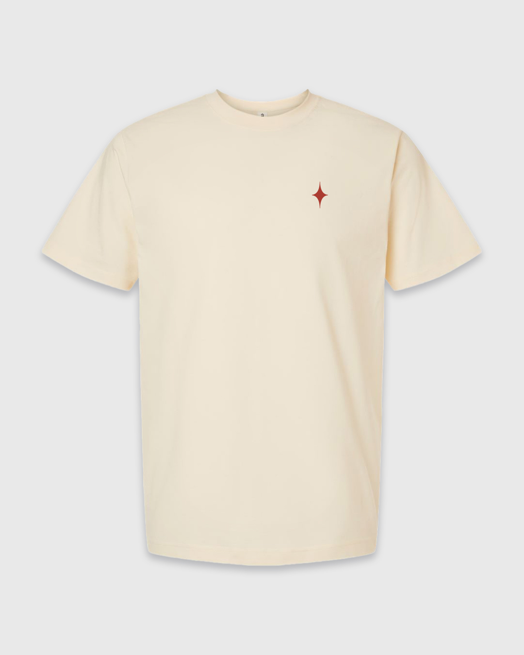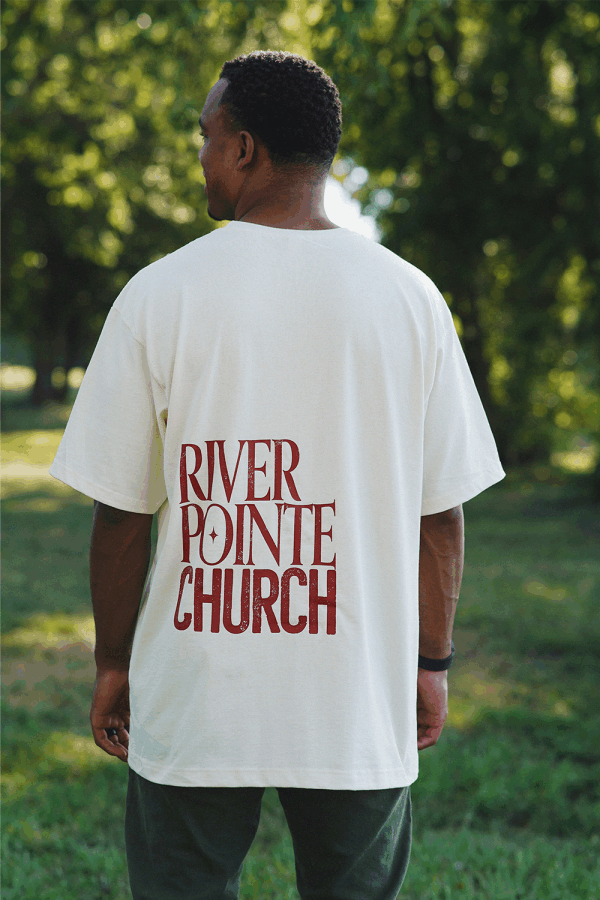 Unisex Ivory (Natural) Heavyweight Street T- Shirt. Front has small diamond shape in rust in top corner. Back has "RIVER POINTE CHURCH" stacked and printed in rust.