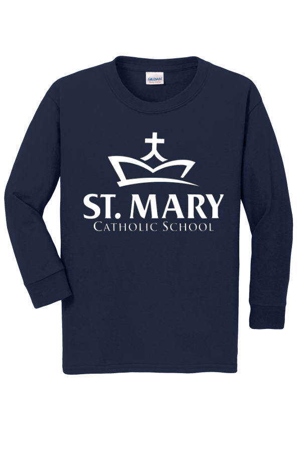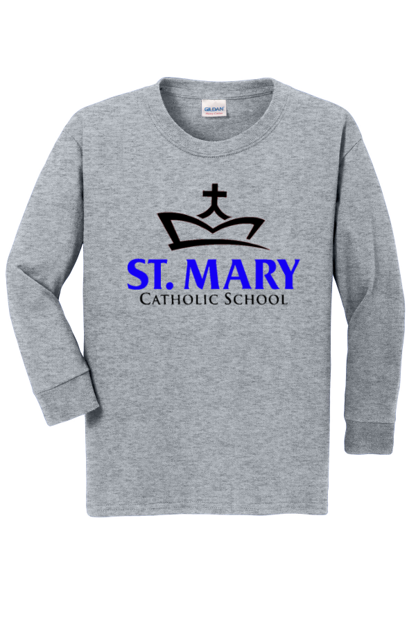 Cotton Long Sleeve T-Shirt- School approved Printed on two sides, Adult and Youth sizes 5.3-ounce 100% cotton, with a 90/10 cotton/poly blend for Sport Grey. Features a non-topstitched classic width rib collar, taped neck and shoulders, rib knit cuffs, and a classic fit with side seams. Includes a recycled high-performance black tear-away label. Please note: This product is transitioning to recycled black tear-away labels, so your order may include a mix of both label types.