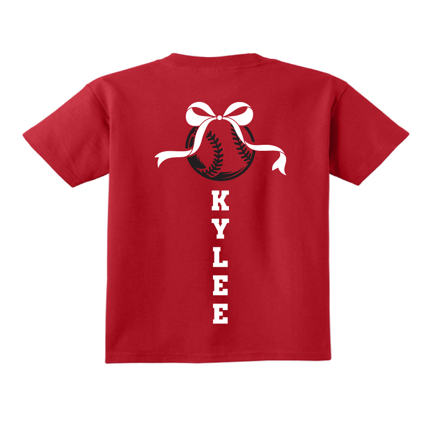 Softball Bow image with Custom back Adult and Youth sizes Adorable softball bow design with a custom back included, made from a classic unisex cotton blend in vibrant red. Upgrade to a sweatshirt or hoodie!