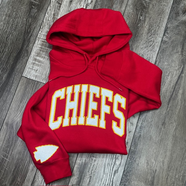 Chiefs Embroidered Hoodie**READ DESCRIPTION BEFORE ORDERING**Choose your hoodie, text fill and thread color to fit your vibe and show your Chiefs pride! An arrowhead can also be added on the sleeve for an additional charge. Text fill & thread color for the arrowhead will match the options you selected for the text. These soft unisex 50/50 crewnecks fit true to size so, order your usual size or size up if an oversized fit is desired.Product MeasurementsProduct Spec Sheet |