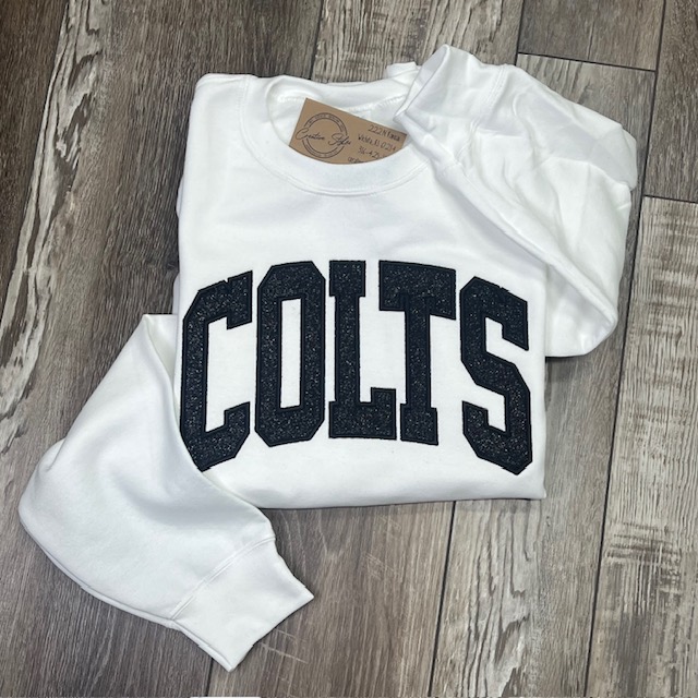 Colts Embroidered Crewneck Sweatshirt **READ DESCRIPTION BEFORE ORDERING** Choose your crewneck color, then select a text fill option and then your thread color! You can create this crewneck to fit your vibe and show your Colt pride! Of course we love the glitter, but soft foam is perfect for guys or if you aren't a glitter gal and want a more traditional collegiate look. You can also add a custom word, name or up to a double digit number to the sleeve. These soft unisex 50/50 crewnecks fit true to size so, order your usual size or size up if an oversized fit is desired. Brand may vary based on availability. If there is not an option listed that you want, please send us an email or add a note to your order! Product Spec Sheet