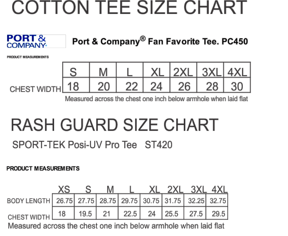 COTTON 100% ring spun cotton RASH GUARD UPF 50 POLYESTER PLEASE CONSULT SIZE CHART BEFORE ORDERING