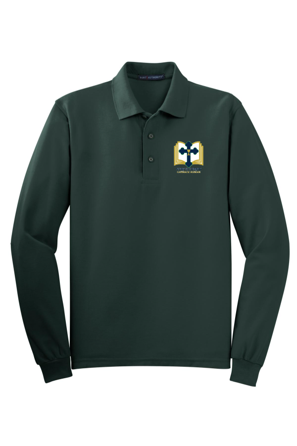 A comfortable classic 60/40 cotton/poly pique unisex cut long sleeve polo. Embroidered on left chest with Corpus Christi school logo.