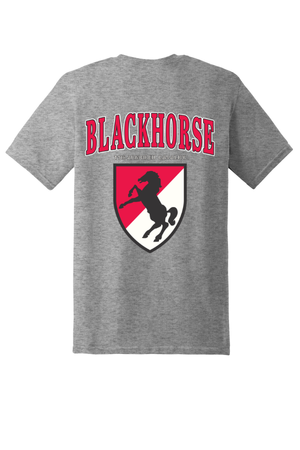 Grey Cotton T-shirt This cotton T-shirt is screen printed on the front and back This T-shirt is heavy weight cotton and has the full front logo with the Blackhorse Vietnam 66-72 imprint on the front