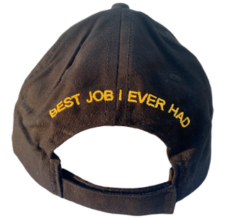 The cap is black color with the American flag embroidered on the side and the words, "BEST JOB I EVER HAD" on the back side.