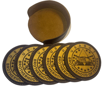 Leatherette Coaster Set Leatherette Coaster Set with engraved USABOT Unit Crest Brown Leatherette Coaster Set with the engraved USABOT Unit Crest. Leatherette offers the look and feel of genuine leather. This richly textured, synthetic material resists water spots, cleans easily, and is durable enough for the rigors of daily use. The high quality workmanship of each leatherette piece is sure to impress every recipient with its elegant individuality.