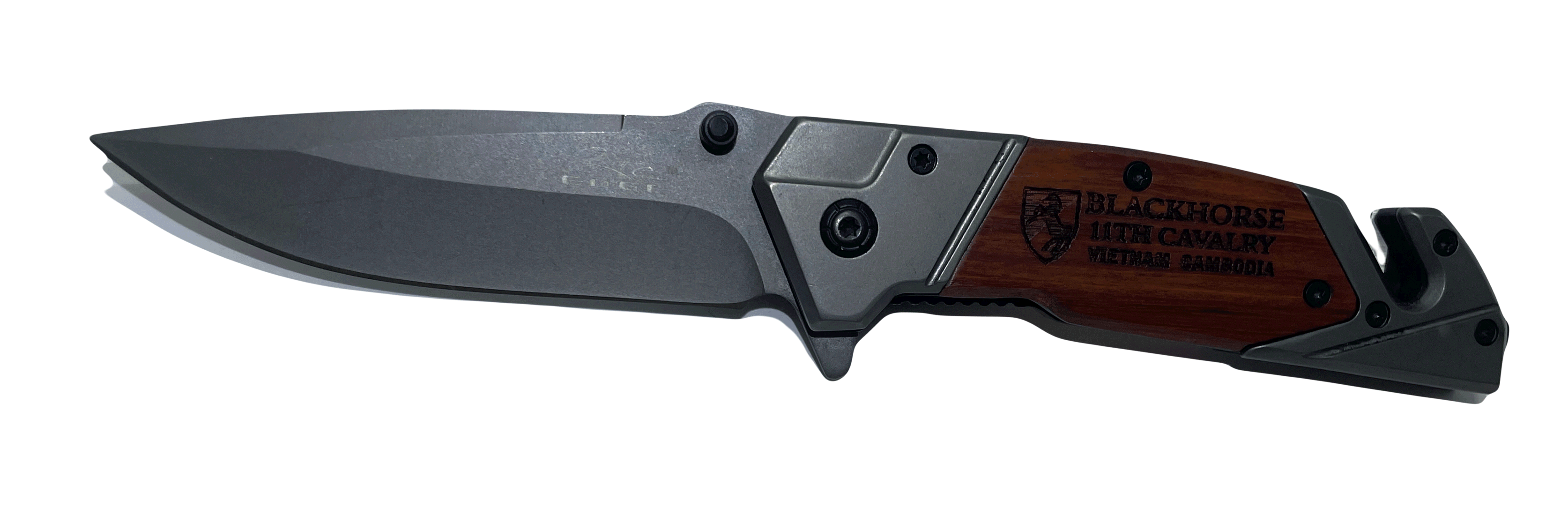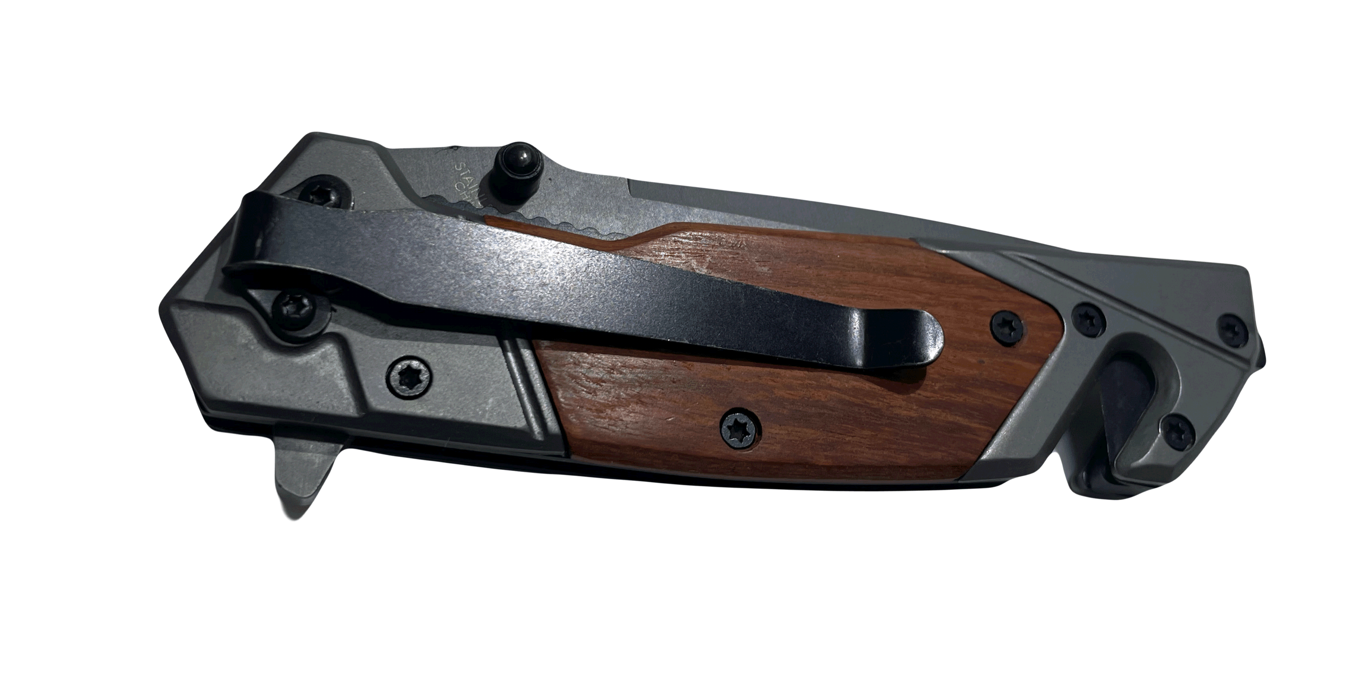 4.5" CLOSED LENGTH ** GREY TITANIUM COATED STAINLESS STEEL BLADE ** NATURAL WOOD HANDLE ** GLASS BREAKER ** SEAT BELT CUTTER ** BELT CLIP
