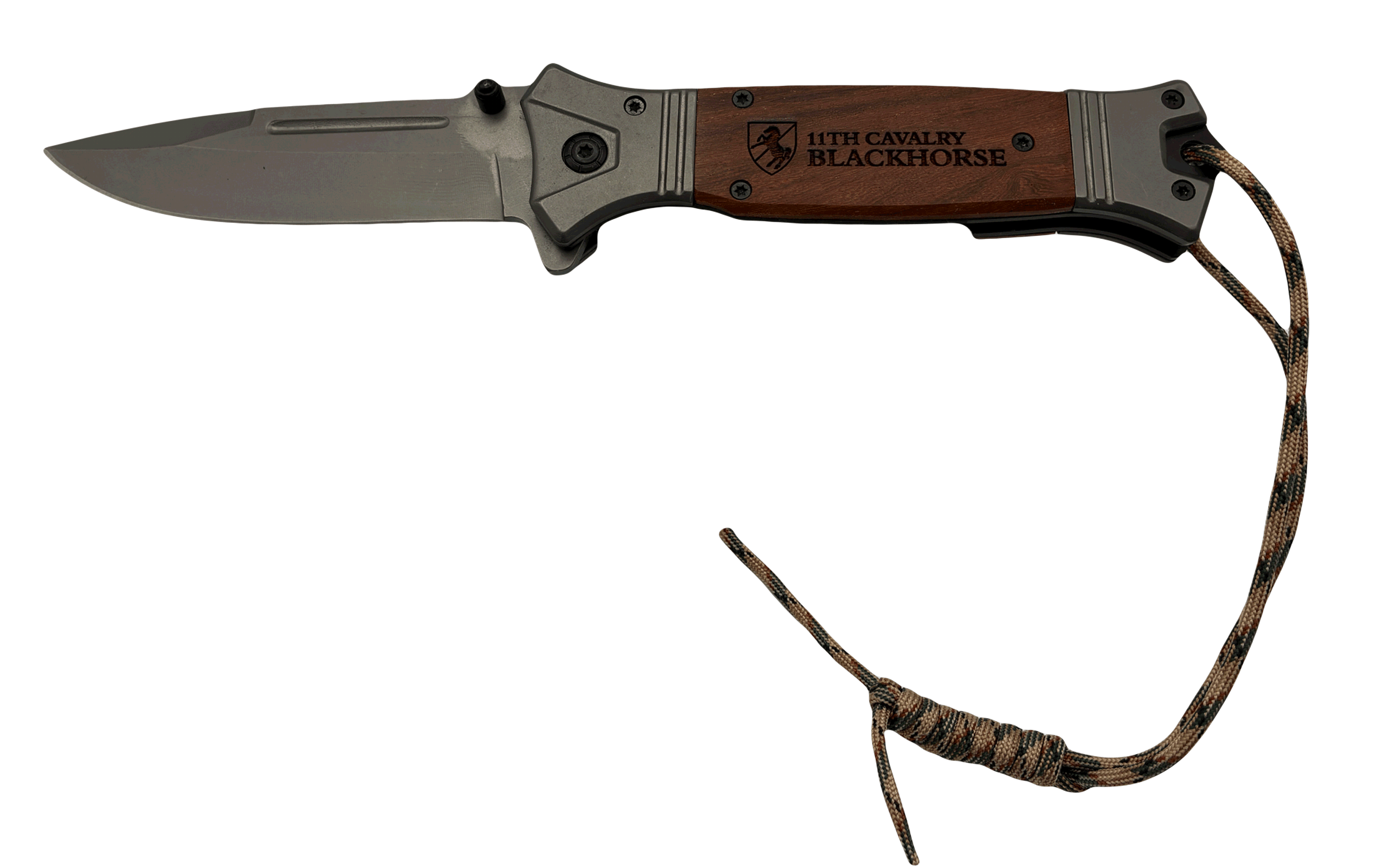 BLACKHORSE 5" WOOD ENGRAVED TITANIUM LINER LOCK 5" CLOSED LENGTH TITANIUM COATED BLADE LASER ENGRAVED WOOD HANDLE TITANIUM COATED BOLSTER LANYARD BELT CLIP