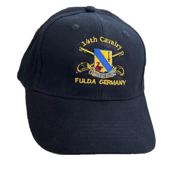 Fulda Germany Black Cap Brushed Twill Black Cap with the 14th Cavalry Unit Crest plus Fulda Germany We were asked to make the Fulda Germany caps for a special order and for a limited time, we are offering them on the website. They are a high quality cap and have the 14th Cavalry Unit Crest above the wording. This soft-brushed twill cap looks great wear after wear. It is beautifully embroidered with the 14th Cavalry Unit Crest.