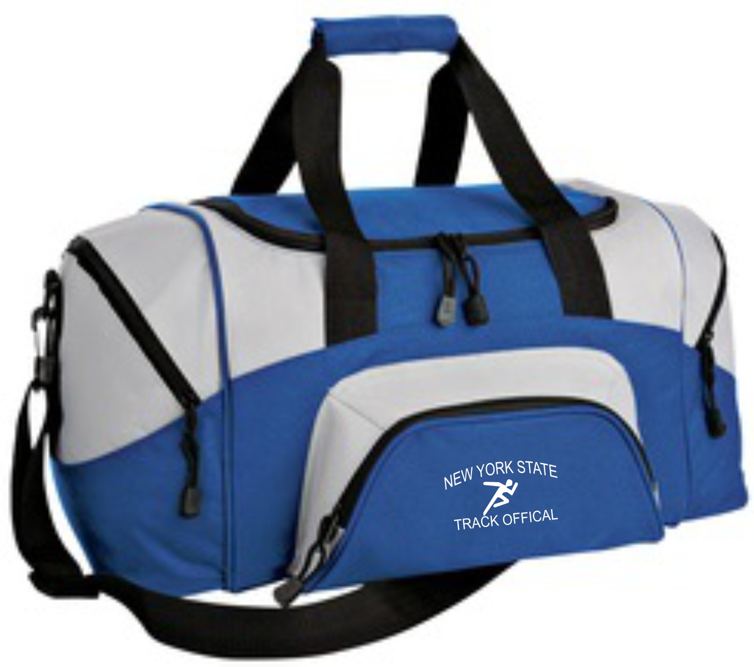 Duffel Bag Port Authority - Small Colorblock Sport Duffel Personalization included. 600-denier polyester with PVC coating. Zippered main compartment has large U-shaped opening with two zipper pulls. Large front pocket. Black handles, reinforced at stress points. Adjustable and detachable shoulder strap. Inside zippered pockets. Embroidered logo and name on top. 10hx20wx10.25d