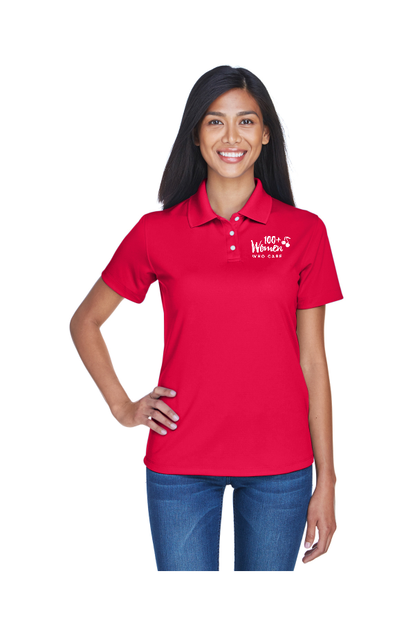 4.8 oz., 100% polyester mini-jacquard; Anti-bacterial; Moisture-wicking; Stain-resistant; UV 15-39 protection; Feminine fit; Flat-knit collar;