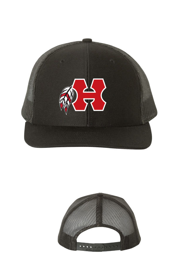 Black snapback trucker mesh back hat with embroidered logo. One size fits most