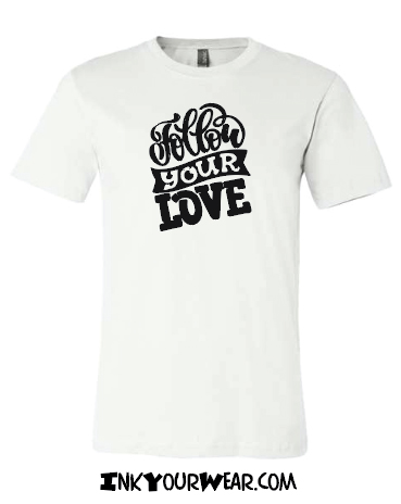 1.1 Follow your Love Multiple shirt colors available or print on a Mug Designs printed in a 100% soft cotton shirt, Unisex cut semi fashion cut (not the classic bulky cut, not too fitted)