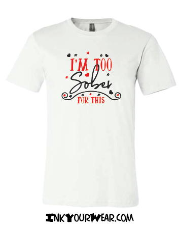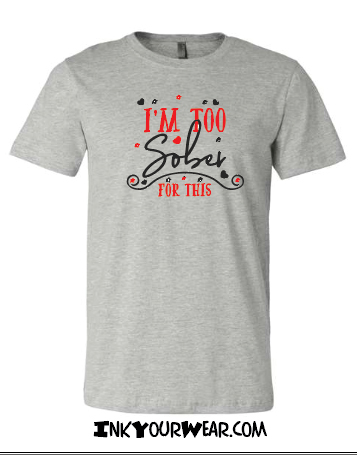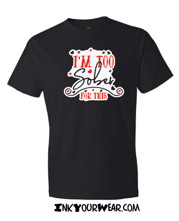 1 I'm too sober for this Multiple shirt colors available or print on a Mug Designs printed in a 100% soft cotton shirt, Unisex cut semi fashion cut (not the classic bulky cut, not too fitted)