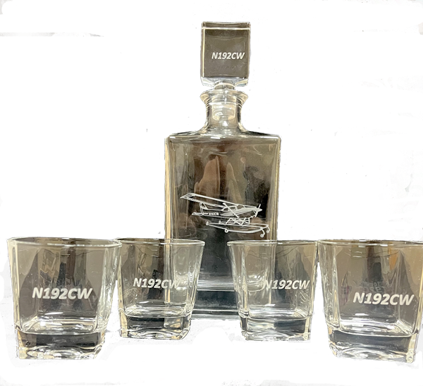 Price includes converting a picture of your aircraft to format that can be lasered on the decanter and includes putting your N-number on the four glasses. You may also choose to have only the n-number of a message on the decanter and glasses.