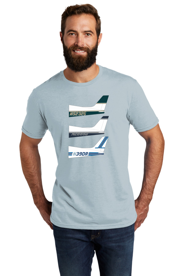 Club Empennage Tee Fairly White, Herb Green, I Like You Blue, Night Sky Navy An incredibly soft sustainable tee that uses an equivalent of up to 6 recycled plastic water bottles. Features a unique graphic of the tail sections of all the LVFC aircraft. Product Spec Sheet