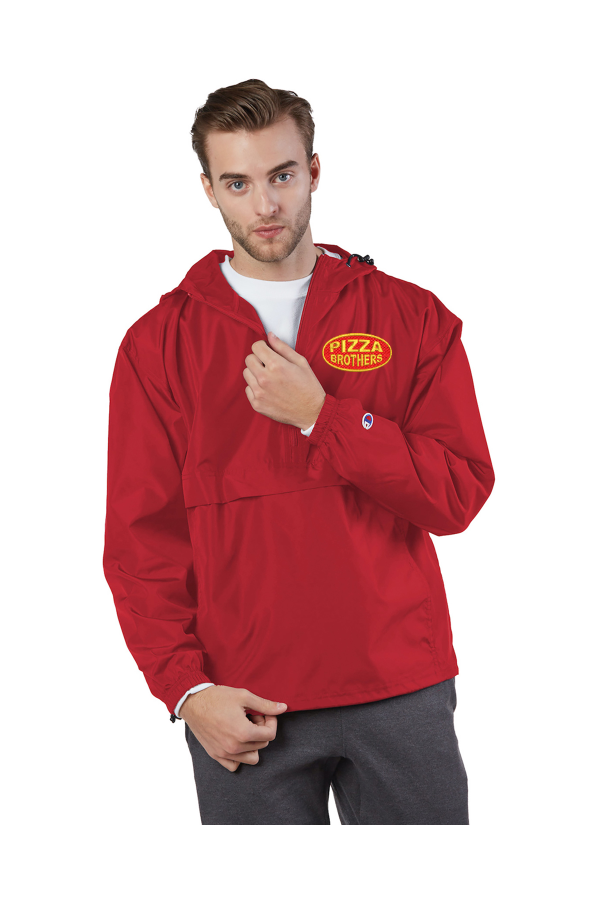 Adult Packable Anorak 1/4 Zip Jacket embroidered left chest for Pizza Brothers 100% Polyester; Wind- and rain-resistant ; Adjustable bungee drawcord at hood and bottom hem; Attached scuba collar with hood; Oversized pouch pocket; Unisex micro poplin; Packable; C patch on left sleeve near cuff; A list status from CDP (Carbon Disclosure Project); Energy Star Partner of the Year (12 consecutive years); Every piece of Champion apparel purchased from our company qualifies for Hanes4Education;