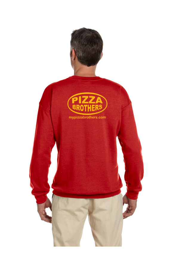 Adult Heavy Blend Adult 8 oz. 50/50 Fleece Crew screen printed left chest and full back for Pizza Brothers 8 oz., 50% USA cotton, 50% polyester; Pill-resistant air jet yarn; Made with 50% sustainably and fairly grown USA cotton; Pill-resistant air jet yarn; Double-needle stitching throughout; Set-in sleeves; 1x1 ribbed collar, cuffs and waistband with spandex;