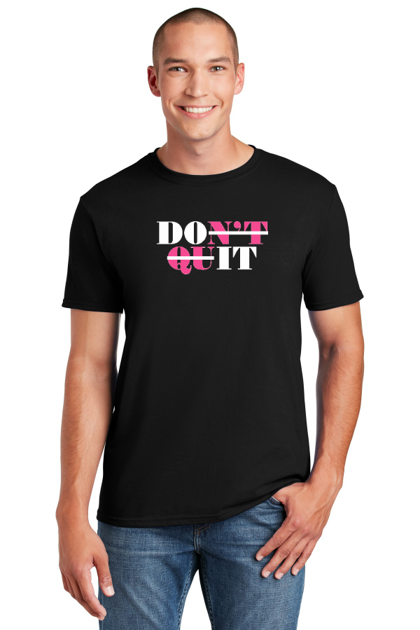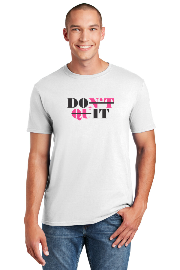 DON'T QUIT ANTI-CANCER TEE screen printed full front on Gildan Sofstyle Tee 4.5-ounce 100% ring spun US cotton. Non-topstitched rib collar. Taped neck and shoulders. Tearaway label. Modern classic fit seamless body. Double-needle sleeves and hem. Product Spec Sheet Color Swatch