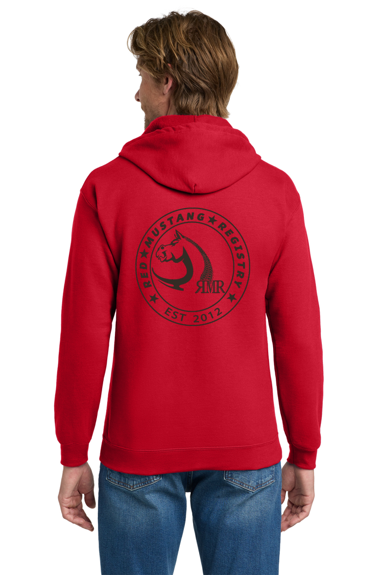 Red Gildan Heavy Blend Full-Zip Hooded Sweatshirt With printed chest and back, optional name/number on right chest. 8-ounce US 50/50 cotton/poly. Double-needle stitching at waistband and cuffs. Unlined hood with dyed-to-match drawcord. YKK metal zipper. 1x1 rib knit cuffs and waistband with spandex. Front pouch pockets. Please note: This product is transitioning from tear-away labels to recycled high-performing black tear-away labels. Your order may contain a combination of both labels. Product Spec Sheet Color Swatch