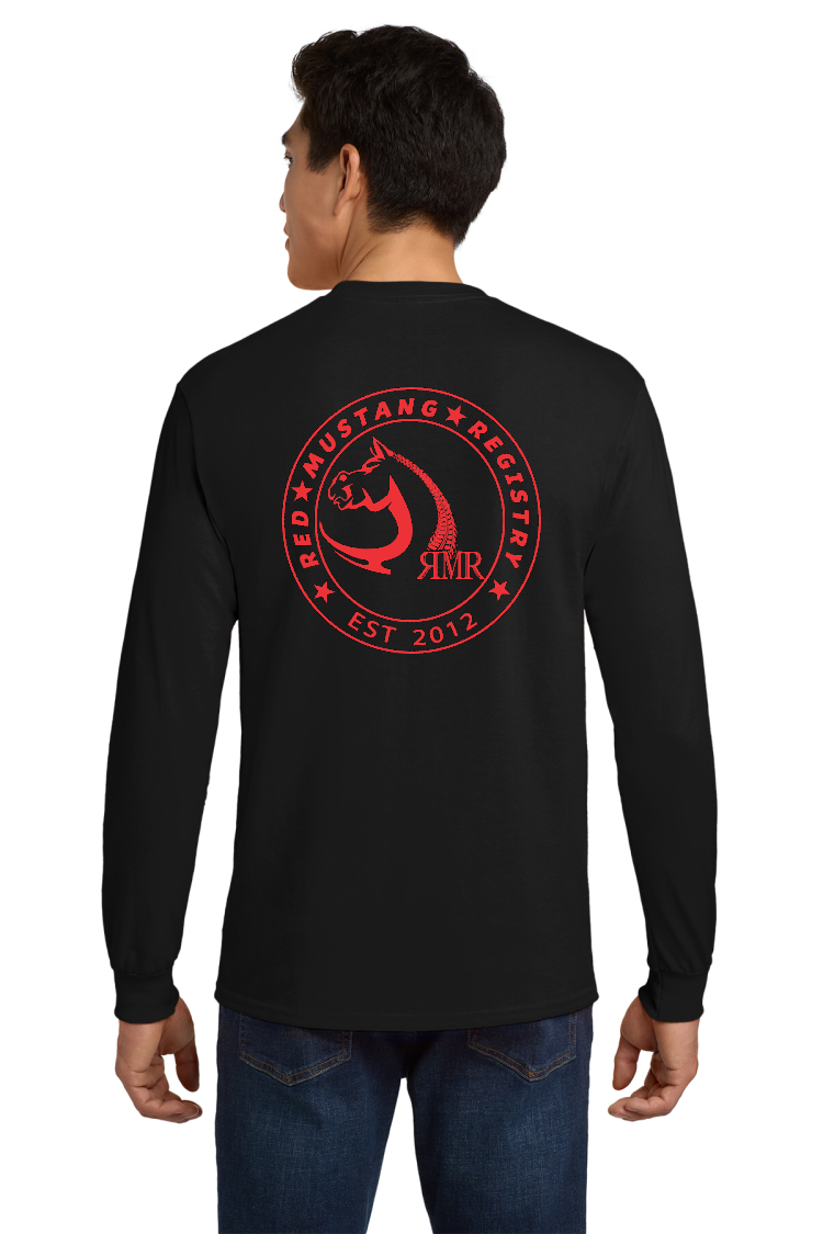 Pocketed Gildan Ultra Cotton 100% US Cotton Long Sleeve T-Shirt With printed chest and back, optional name/number on right chest. 6-ounce 100% US cotton. Non-topstitched classic width rib collar. Taped neck and shoulders. Left chest pocket. Rib knit cuffs. Classic fit seamless body. Recycled high-performing black tear-away label. Long Sleeve pocket tee is only available in Black. Product Spec Sheet Color Swatch