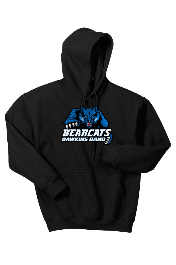 Gildan Heavy Blend Hooded Sweatshirt printed full front for Dawkins Band Color Options: Black or Sport Grey 8-ounce 50/50 cotton/poly. Double-needle stitching at waistband and cuffs. Double-lined hood with dyed-to-match drawcord. 1x1 rib knit cuffs and waistband with spandex. Front pouch pocket. Product Spec Sheet