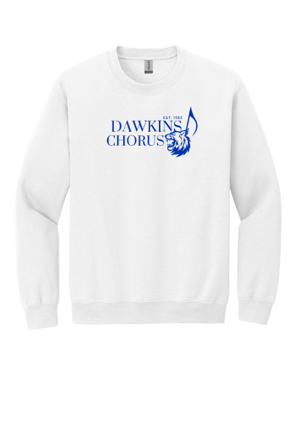 Gildan Heavy Blend Crewneck Sweatshirt printed full front for Dawkins Chorus 8-ounce 50/50 cotton/poly. Double-needle stitching at waistband and cuffs. 1x1 rib knit collar cuffs and waistband with spandex. Recycled high-performing black tear-away label. Product Spec Sheet