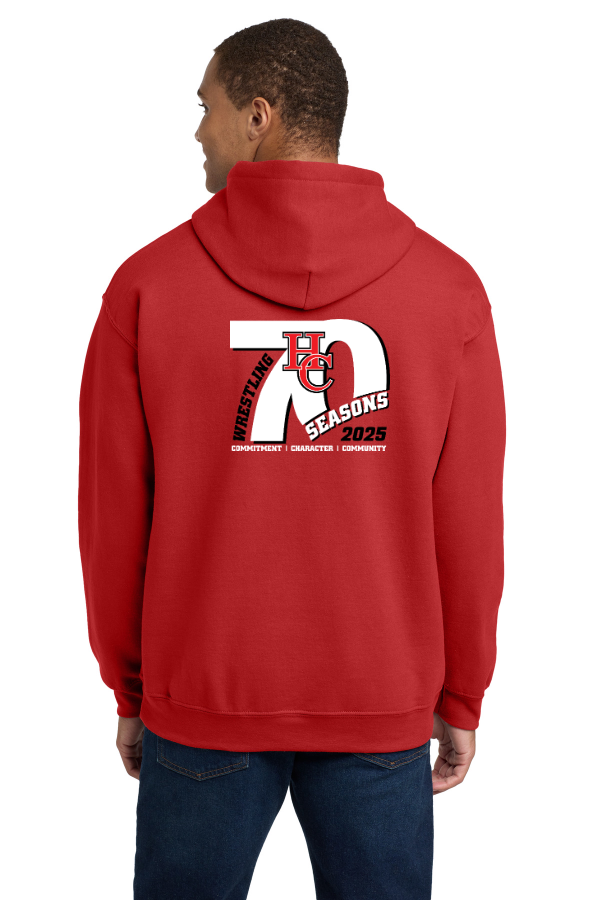 Heavy Blend Hooded Sweatshirt Gildan 18500 50/50 cotton/poly. Double-needle stitching at waistband and cuffs. Double-lined hood with dyed-to-match drawcord. 1x1 rib knit cuffs and waistband with spandex. Front pouch pocket. Recycled high-performing black tear-away label Product Spec Sheet