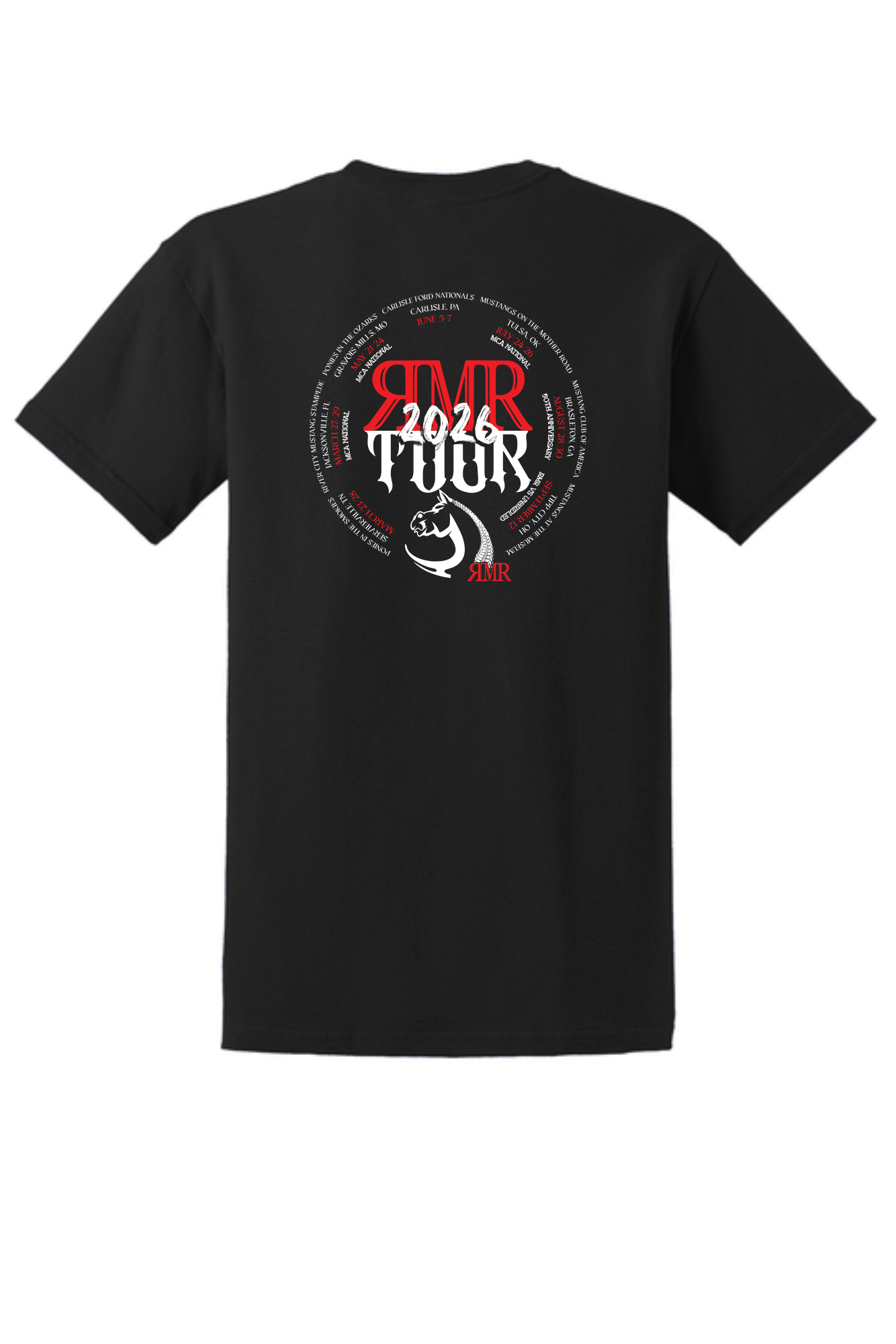 Black Gildan Ultra Cotton 100% US Cotton Tour T-Shirt With printed chest and back. 6-ounce 100% US cotton)50/50 cotton/poly (Dark Heather Safety Pink Safety Green Safety Orange Heathered Cardinal Heathered Indigo Heathered Navy Heathered Sapphire) 99/1 cotton/polyester (Ash)90/10 cotton/polyester (Sports Grey Antique Cherry Red Antique Irish Green Antique Royal)Prepared for dying (PFD) fabric which means there are no starches sizing or finishes on the fabricNon-dyed fabric with visible specks of fibers and cotton seeds (Natural)Non-topstitched classic width rib collarTaped neck and shouldersClassic fit seamless bodyRecycled high-performing black tear-away label Product Spec Sheet Color Swatch