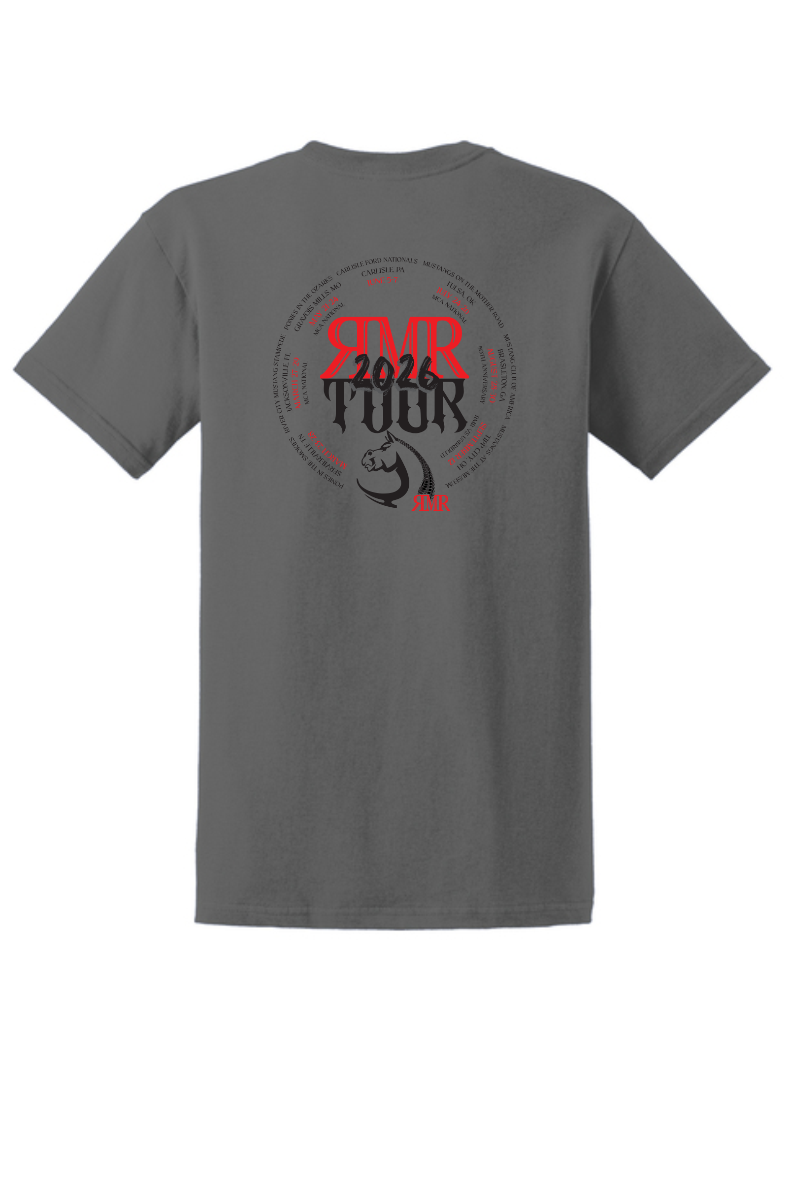 Charcoal Gildan Ultra Cotton 100% US Cotton Tour T-Shirt With printed chest and back. 6-ounce 100% US cotton)50/50 cotton/poly (Dark Heather Safety Pink Safety Green Safety Orange Heathered Cardinal Heathered Indigo Heathered Navy Heathered Sapphire) 99/1 cotton/polyester (Ash)90/10 cotton/polyester (Sports Grey Antique Cherry Red Antique Irish Green Antique Royal)Prepared for dying (PFD) fabric which means there are no starches sizing or finishes on the fabricNon-dyed fabric with visible specks of fibers and cotton seeds (Natural)Non-topstitched classic width rib collarTaped neck and shouldersClassic fit seamless bodyRecycled high-performing black tear-away label Product Spec Sheet Color Swatch