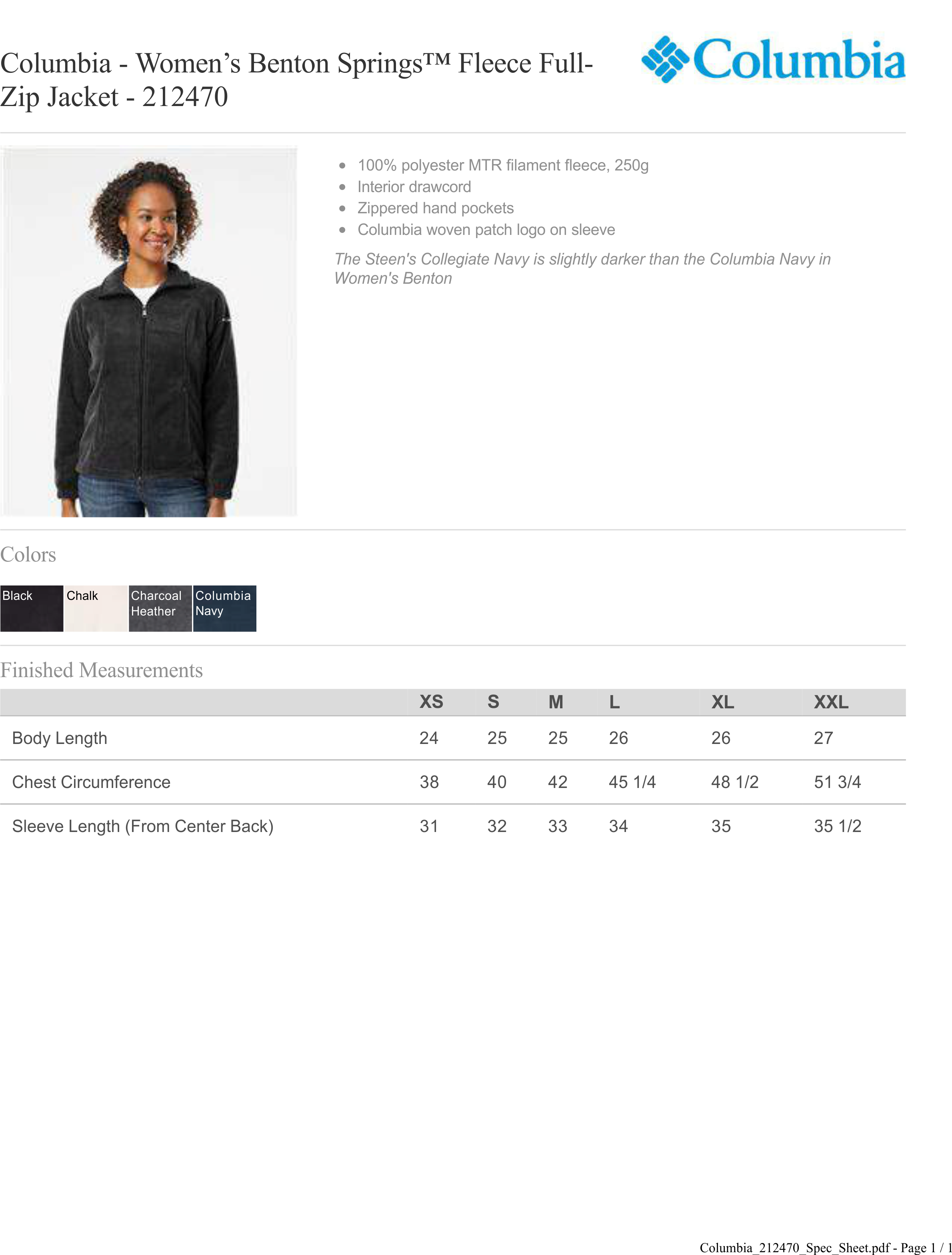 Description Columbia - Women's Benton Springs Full Zip Jacket embroidered right chest with CREATIVE logo. 100% polyester MTR filament fleece, Zippered hand pockets, Interior drawcord.