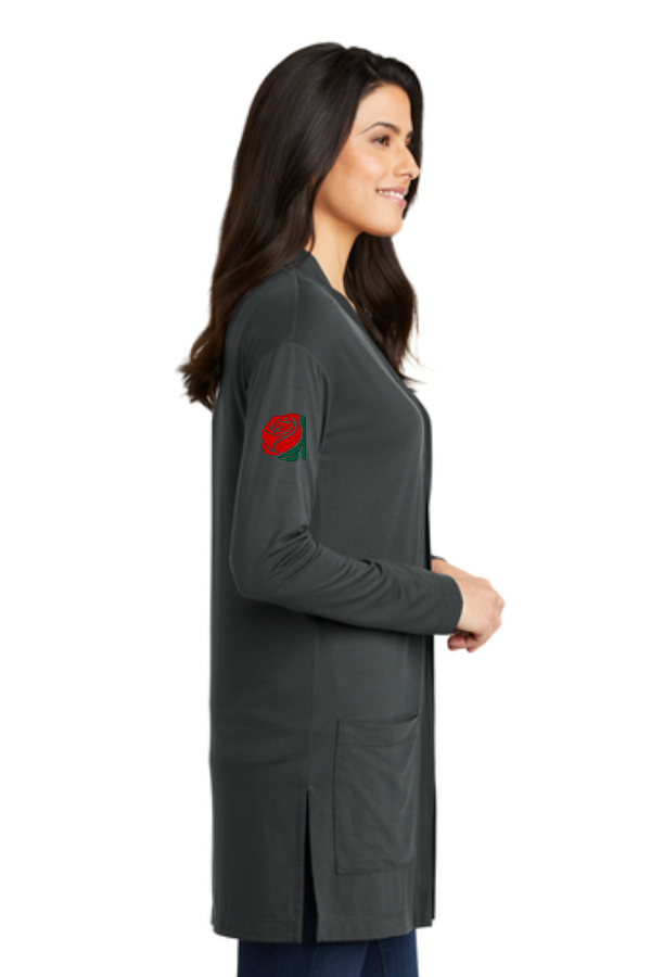 DKG Ladies Cardigan with choice of logo Port Authority Ladies Concept Long Pocket Cardigan . LK5434 Choose either Left Chest DKG embroidery and right sleeve Rose embroidery, or Sleeve only embroidery. A versatile cardigan with ease of movement and a longer length ideal for a busy life. 4.4-ounce 62/33/5 poly/rayon/spandex jersey knit Open front Two patch pockets Hem vents Product Spec Sheet Color Swatch