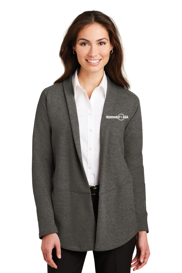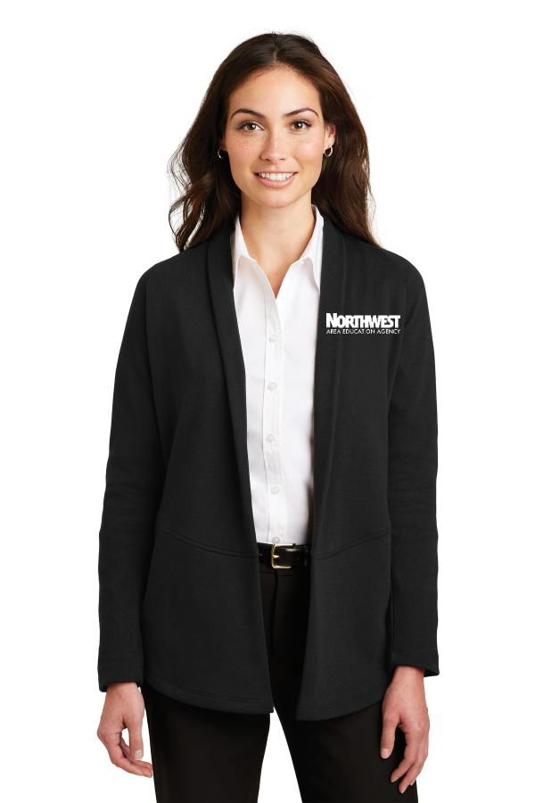 Port Authority Ladies Interlock Cardigan Choice of 4 colors. L807 This lightweight dual-color cardigan layers beautifully and has a timeless appeal. An open front and front and back seaming details at the waist give it sophistication. 7.5-ounce 60/40 cotton/poly Shawl collar Raglan sleeves Side seam pockets Product Spec Sheet Color Swatch