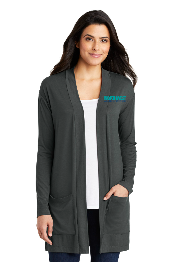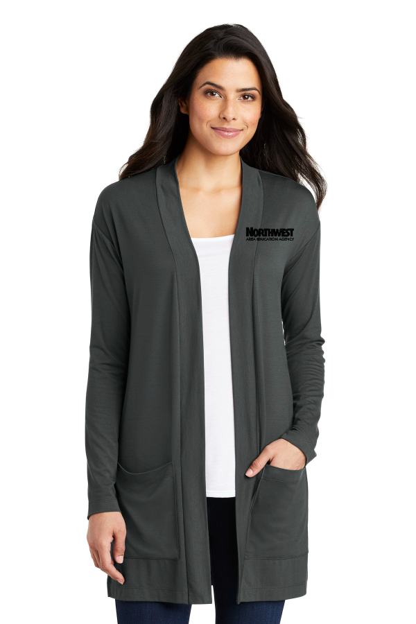 Port Authority Ladies Concept Long Pocket Cardigan Choice of two colors - LK5434 A versatile cardigan with ease of movement and a longer length ideal for a busy life. 4.4-ounce 62/33/5 poly/rayon/spandex jersey knit Open front Two patch pockets Hem vents Product Spec Sheet Color Swatch